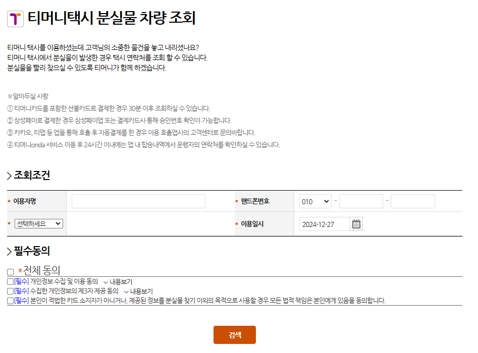 - 티머니택시 앱 또는 웹사이트에서 분실물 신고서를 작성하세요.분실물의 특징, 탑승·하차 시간, 장소를 자세히 기재하면 신속히 대응받을 수 있습니다.