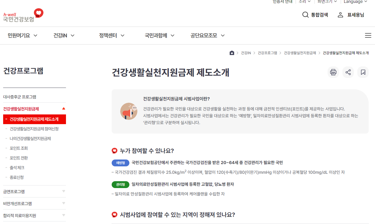 국민들이 자신의 건강상태를 잘 알 수 있도록 정보를 제공해주고, 각자가 능동적으로 건강한 생활을 실천하도록 유도하는 사업이에요. 그리고 개선되는 정도에 따라서 점수를 주는 시스템이죠. 이 시범사업은 건강관리가 필요한 분들을 위한 '예방형'과, 만성질환 관리 프로그램에 등록된 환자들을 위한 '관리형'으로 나뉘어 진행된답니다. 이렇게 둘로 나눠서 진행되는 이유는 더 효과적으로 도움을 주기 위해서예요.