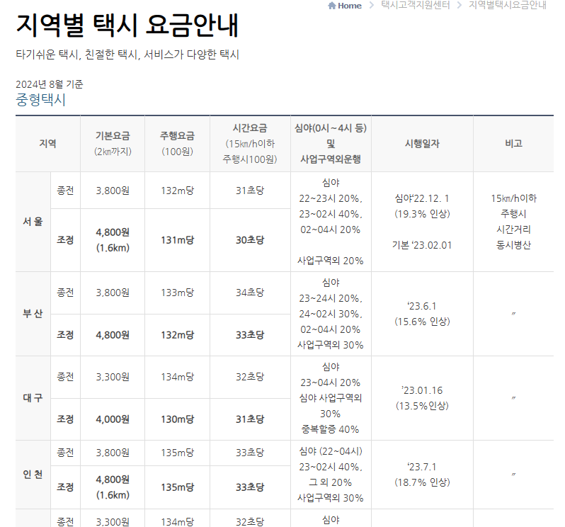 아래 참고하여 택시 기본요금 확인해 보시길 바랍니다.