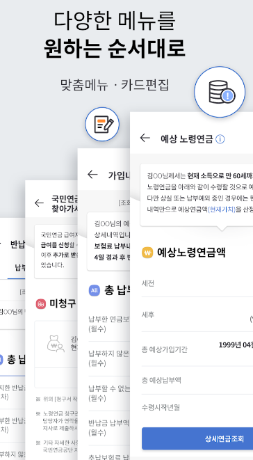 온라인을 통해 쉽게 조회할 수 있으며, 특히 모바일 스마트폰 사용자를 위한 서비스도 마련되어 있습니다. '내 곁에 국민연금' 모바일 앱을 통해 제공되는 예상연금간단계산 서비스를 활용하면, 사용자는 매월 납부하는 연금 보험료를 입력하고, 가입 시작일로부터 10년 이상 납부한 경우를 기준으로 예상되는 연금액을 손쉽게 확인할 수 있습니다.