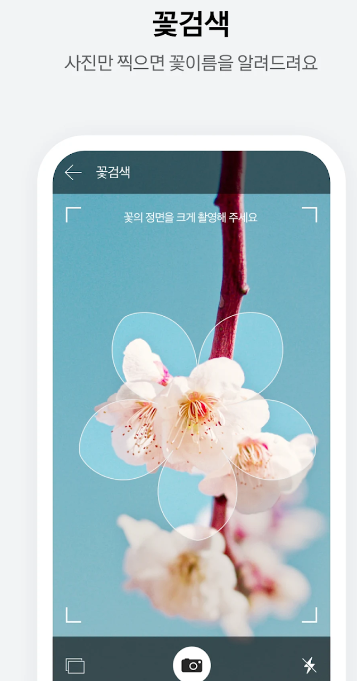 꽃을 화면에 가득 차게 하고, 화면 중앙에 나타나는 실선의 꽃 모양과 일치하게 조정한 뒤, 화면 하단의 촬영 버튼을 클릭하면 됩니다.