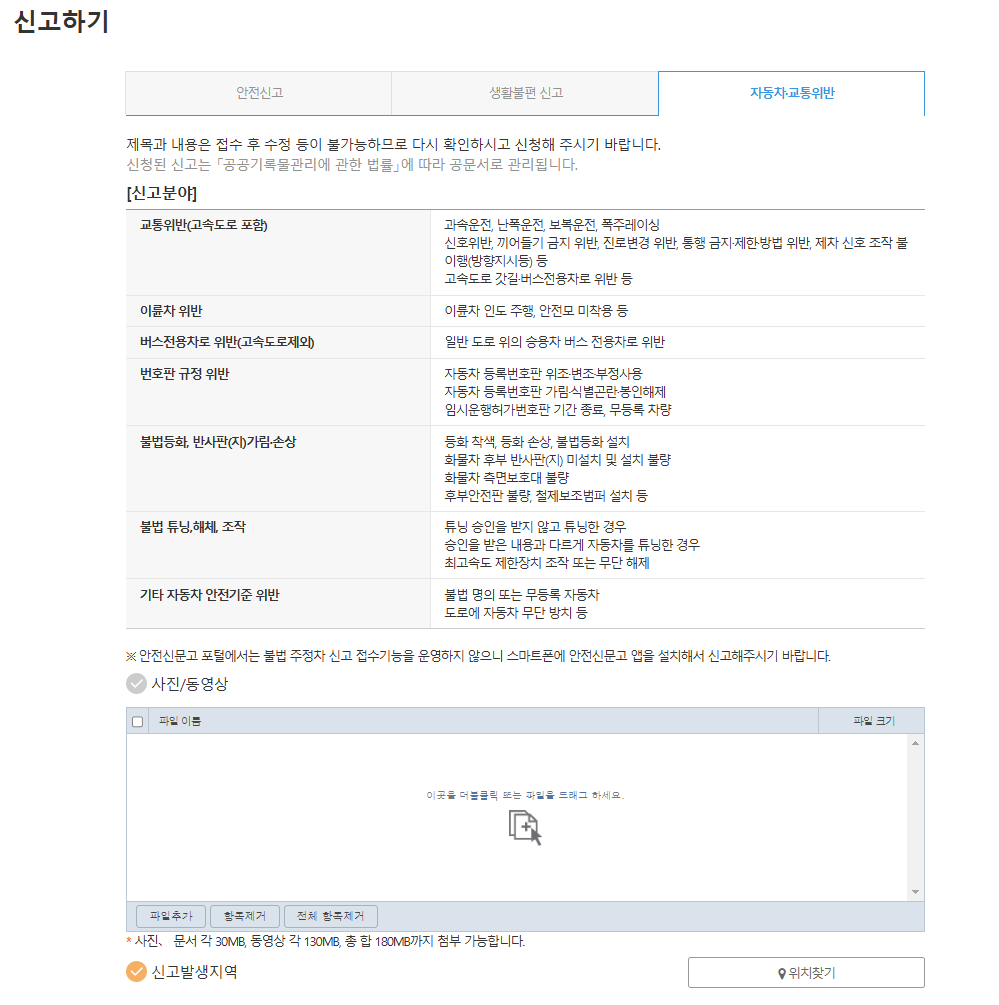 - 발생 지역과 위반 내용을 간단히 작성(900자 이내)합니다.