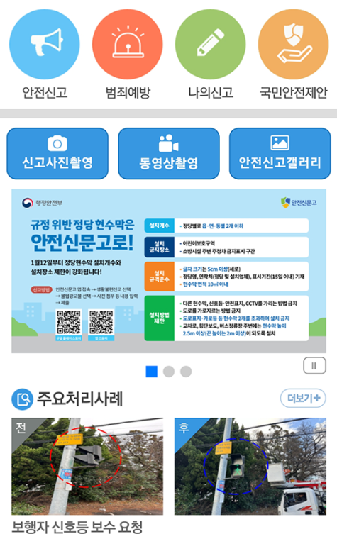 먼저, 안전신문고 앱을 다운로드하고 실행해 주세요. 앱을 열면 상단에 ‘안전’, ‘불법주정차’, ‘자동차교통위반’, ‘생활불편’ 등의 메뉴가 보일 거예요. 여기서 '불법주정차'를 선택합니다.