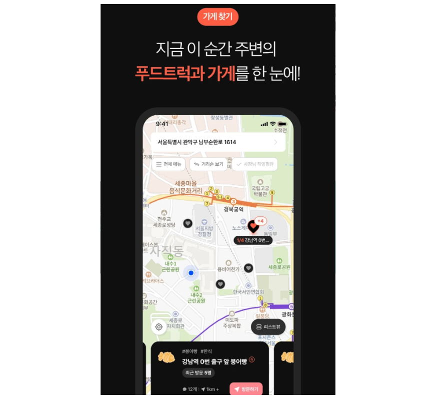 - 길거리 간식 검색: 주변의 붕어빵뿐만 아니라 잉어빵, 국화빵 등 다양한 메뉴를 확인할 수 있습니다.