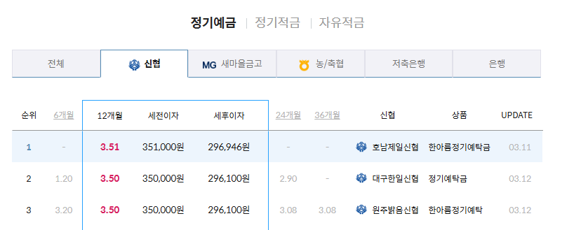 지점마다 금리가 다르기때문에 미리 확인하시고 가입하셔야 합니다. 또한, 신협뿐만 아니라 새마을금고같이 높은 금리를 제공하는 상품도 많은데요. 빠르게 비교해보시고 원하는 상품에 가입하시기 바랍니다.