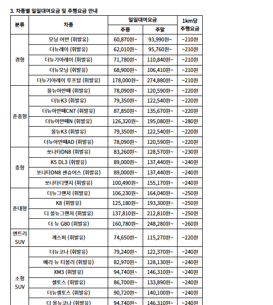 각 차종마다 이용 요금이 다르니, 아래 참고하여 빠르게 알아보시길 바랍니다.