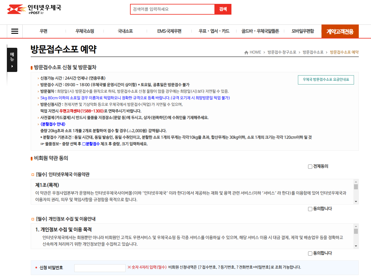 - "방문접수소포 예약" 메뉴로 이동.