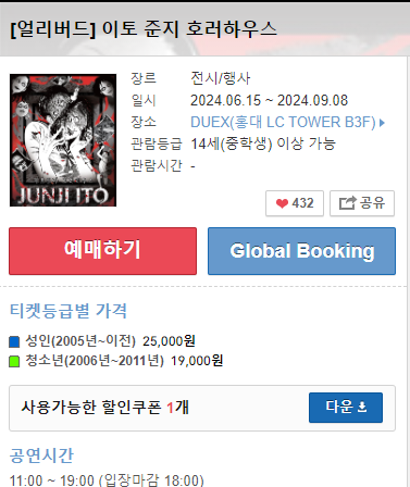 이토준지 호러하우스 예매안내 입니다. 이토준지 작품을 현실적으로 체험할 수 있도록 한국에서 전시한다고 합니다. 인기 있는 만큼 티켓을 한정된 수량으로 판매하고 있는데요.