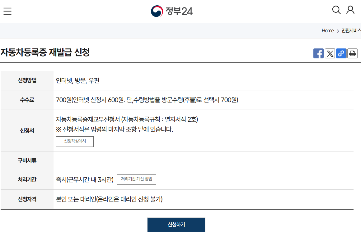 저도 직접 받아봤으며, 간편하게 신청할 수 있었는데요. 아래 참고하여 자동차 등록증 재발급 받아보시길 바랍니다.