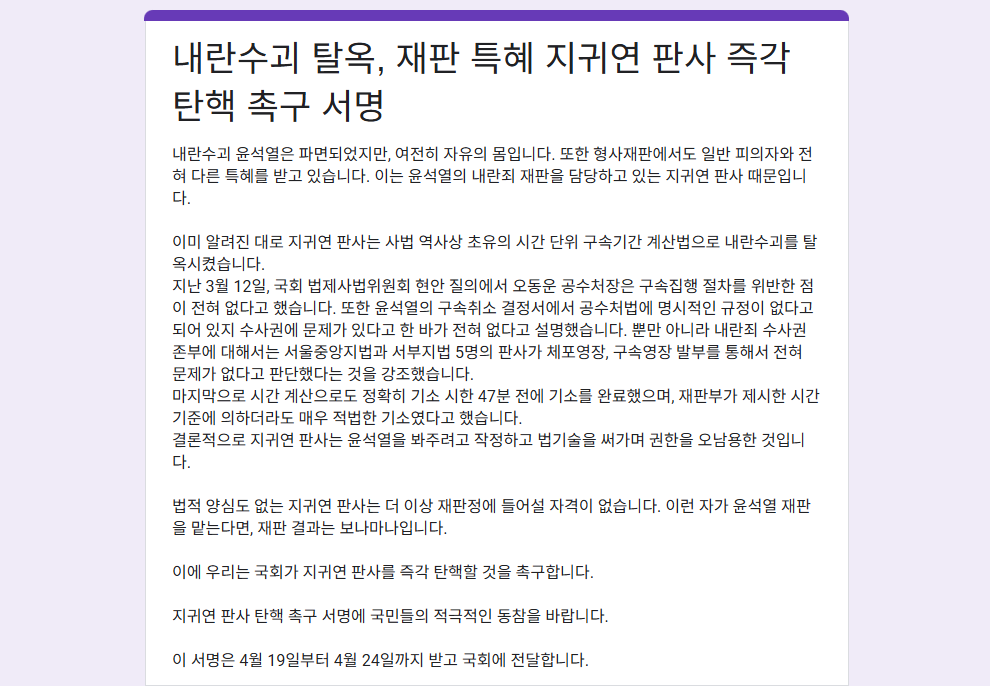 지귀연판사 탄핵청원 링크 바로가기 안내입니다. 4월 19일부터 지귀연판사 탄핵청원 서명운동이 실시되었습니다. 4월24일까지 받을 예정이며, 국회에 제출한다고 하는데요. 구글폼으로 서명 받고 있으니 아래 참고하여 참여해보시길 바랍니다.