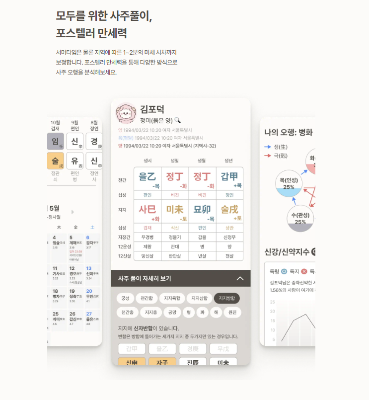 - 그런 다음, 각 천간과 지지에 속한 오행을 분석해서 개인의 오행 균형을 살펴봅니다. 이 균형이 성격과 운세에 큰 영향을 미치거든요.