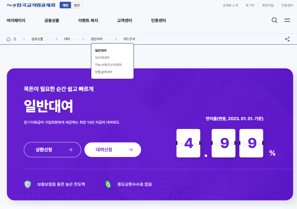 한국교직원공제회는 여러 가지 대출 상품을 제공하고 있어요. 일반대여는 최장 10년까지 저금리로 이용할 수 있는 기본 대출 상품으로 현재 연 3.9%의 금리를 적용하고 있습니다. 이와 함께, THE-K 복지누리대여라는 상품도 있어요. 이 대출은 결혼, 출산, 주택 구입, 임차 시 더 낮은 금리로 제공되니 필요한 경우 꼭 확인해 보세요.