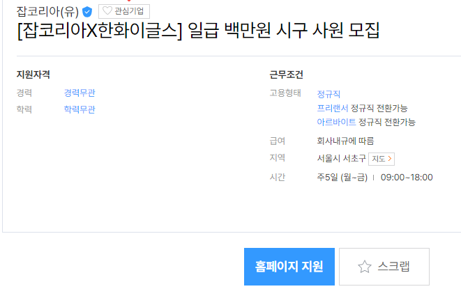 근무 조건 업무 내용: 알바몬X잡코리아 브랜드 데이에서 진행되는 한화이글스 경기 관람 및 시타