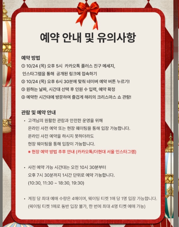 2024 더현대 서울 크리스마스 사전 예약 방법 유의사항 안내입니다. 이번 2024년 더현대 서울 백화점에서 크리스마스 빌리지 해리의 크리스마스 쇼가 공개되었습니다. 1차 사전예약 일시까지 발표되었는데요.