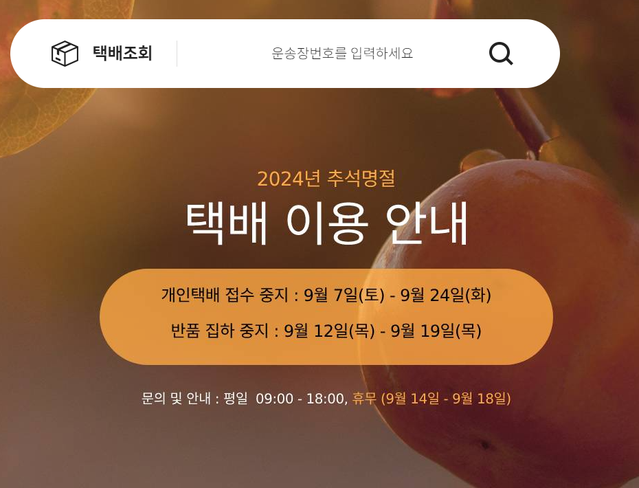 한편, 로젠택배의 2024 추석명절 이용 안내에 따르면 개인 접수는 9월 7일(토)부터 9월 24일(화)까지 중지되며, 반품 집하는 9월 12일(목)부터 9월 19일(목)까지 중지됩니다.