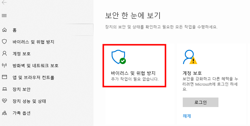 2. "바이러스 및 위협방지" 클릭하여 접속해 줍니다.