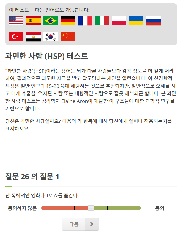 hsp 테스트 링크 과민한사람 자가진단 검사 안내입니다. "과민한 사람"(HSP)은 뇌가 감각 정보를 일반인보다 더 깊이 분석하여, 자극에 쉽게 압도되는 사람들을 가리키는 용어입니다. 이 과민한 성향에 대한 테스트는 심리학자 엘레인 아론(Elaine Aron)이 개발한 이 구조적 개념에 근거하여, 관련 과학적 연구를 토대로 설계되었습니다.